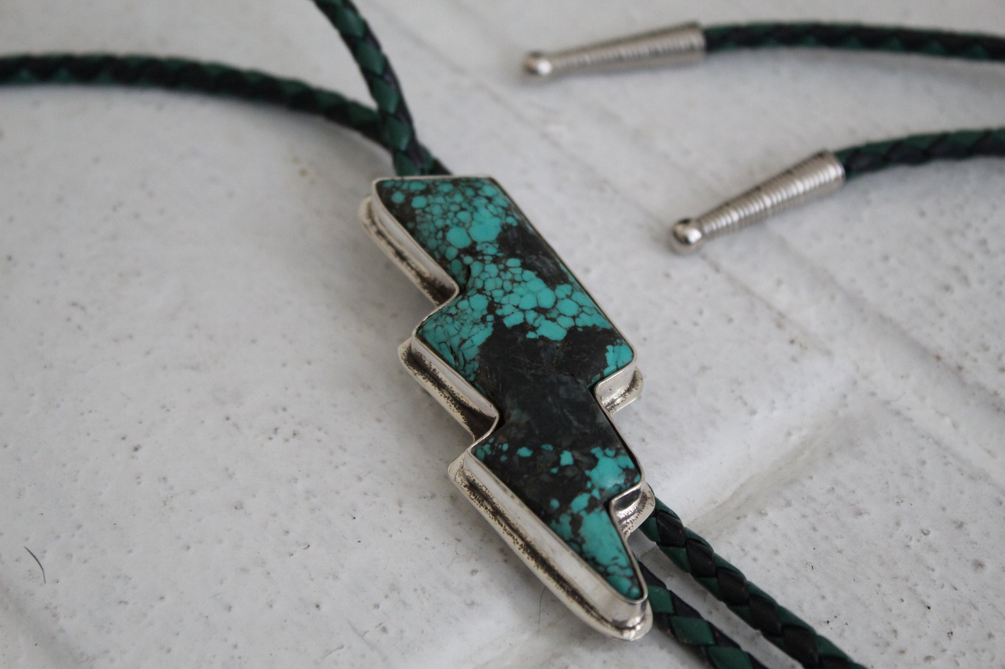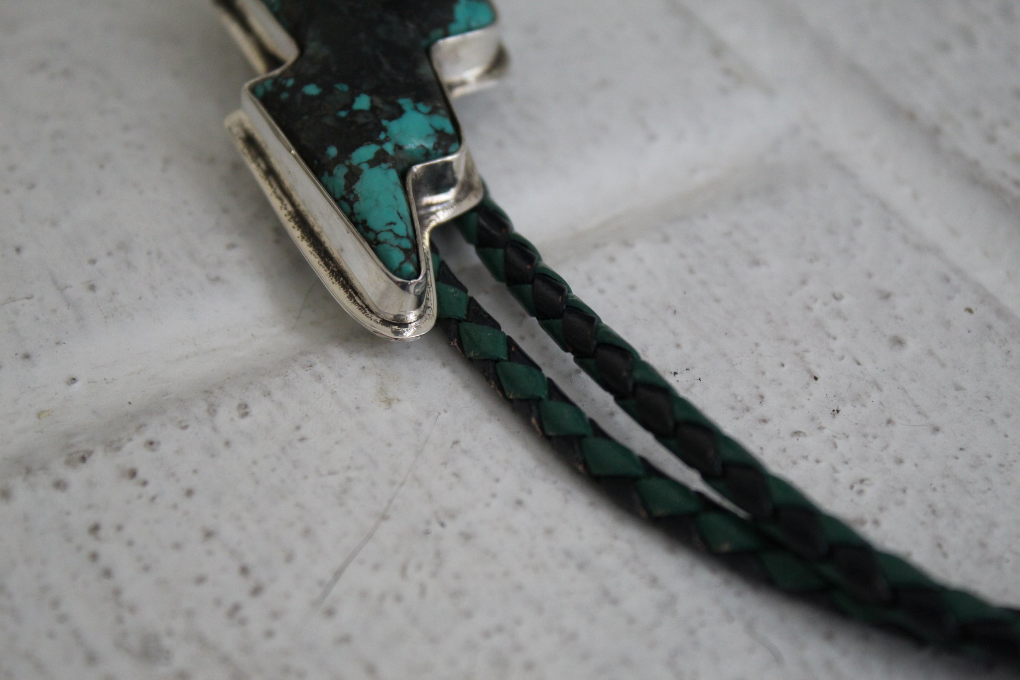 Vintage Cut Turquoise Bolt set in Sterling Silver on a Black/Green 36” Bolo Rope