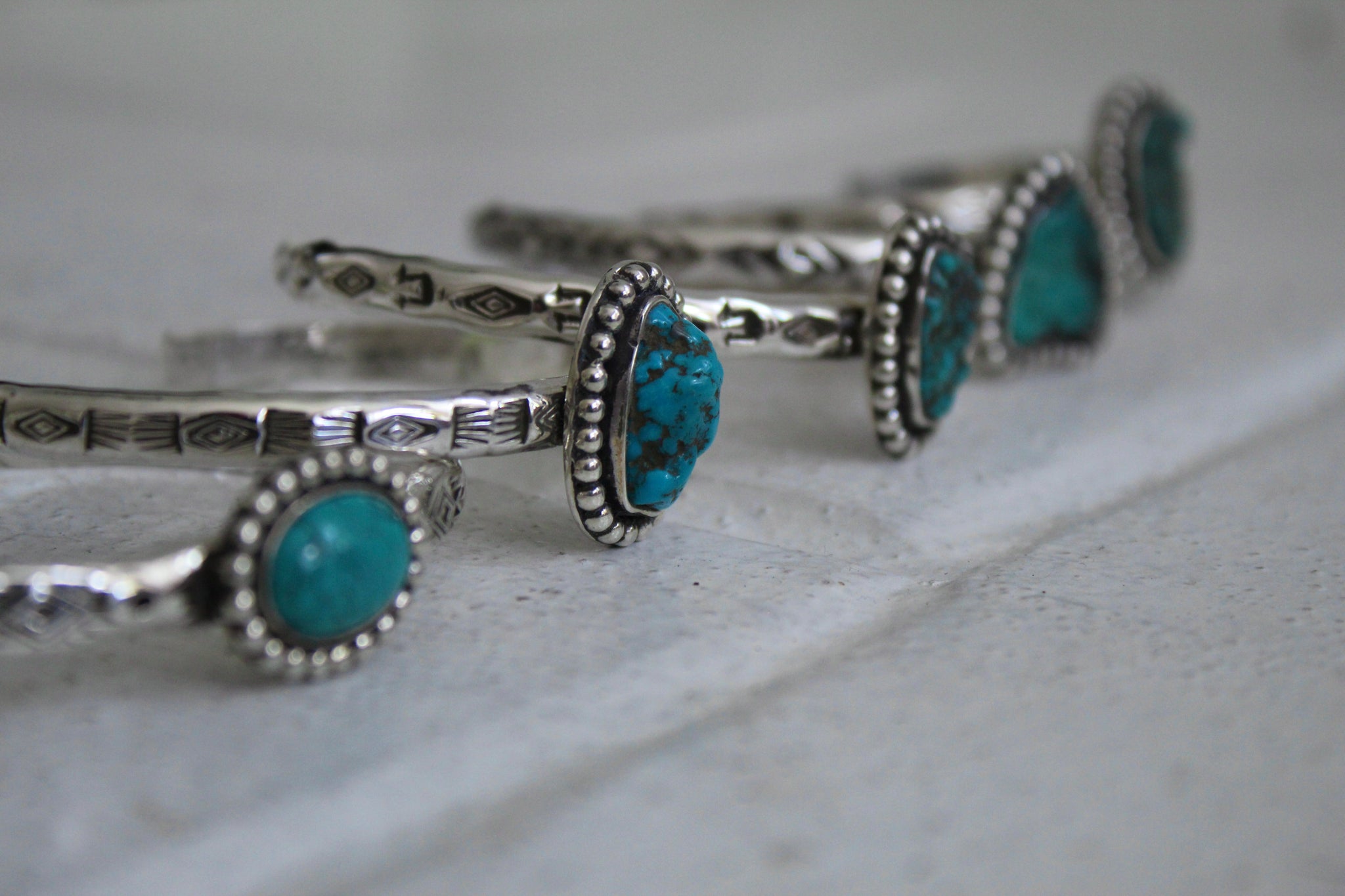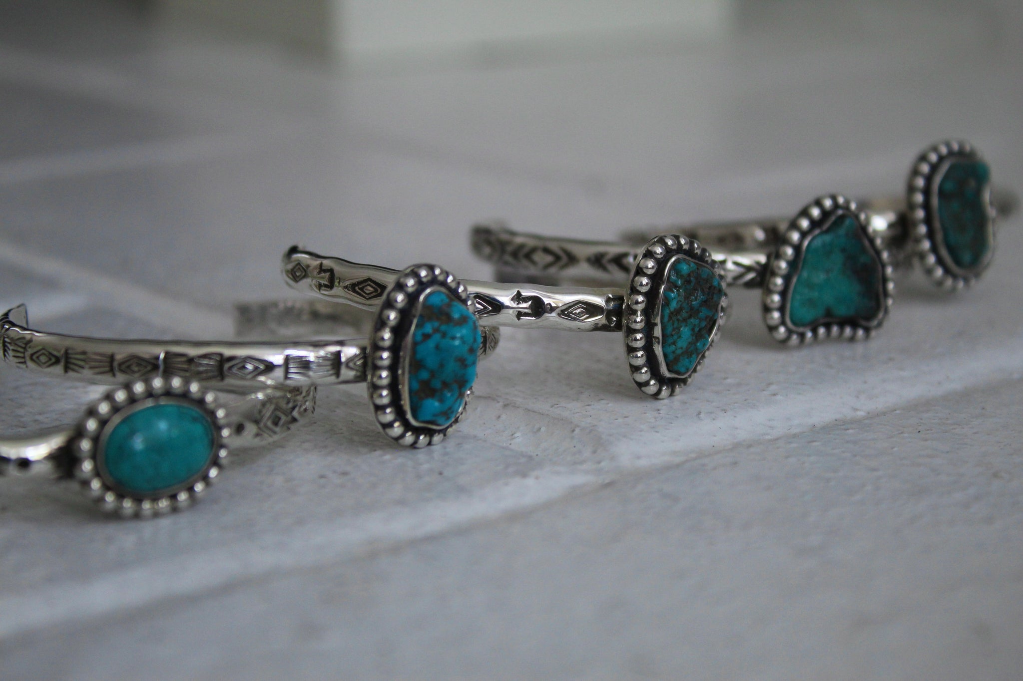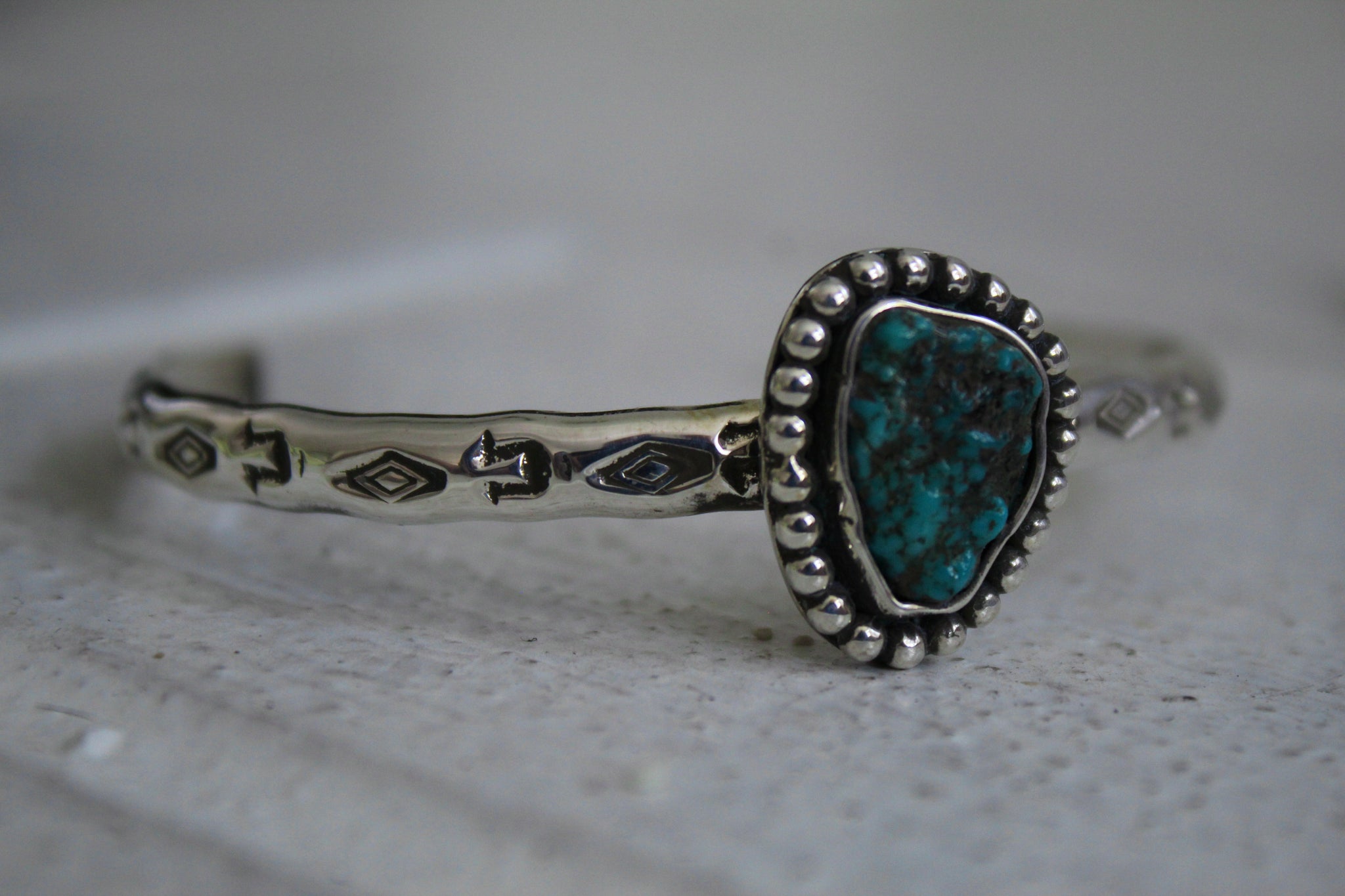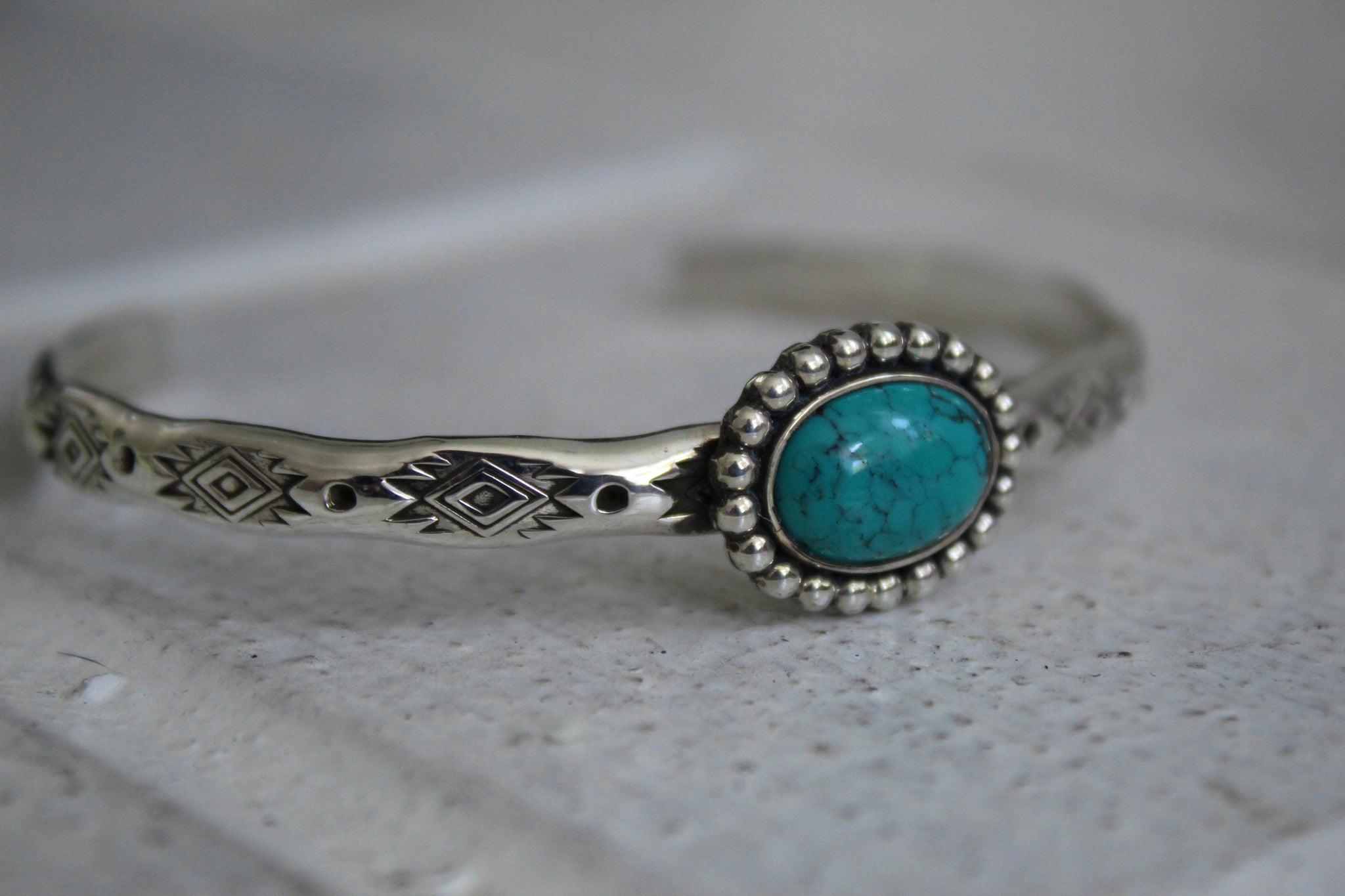 Turquoise set in hand stamped Sterling Silver.